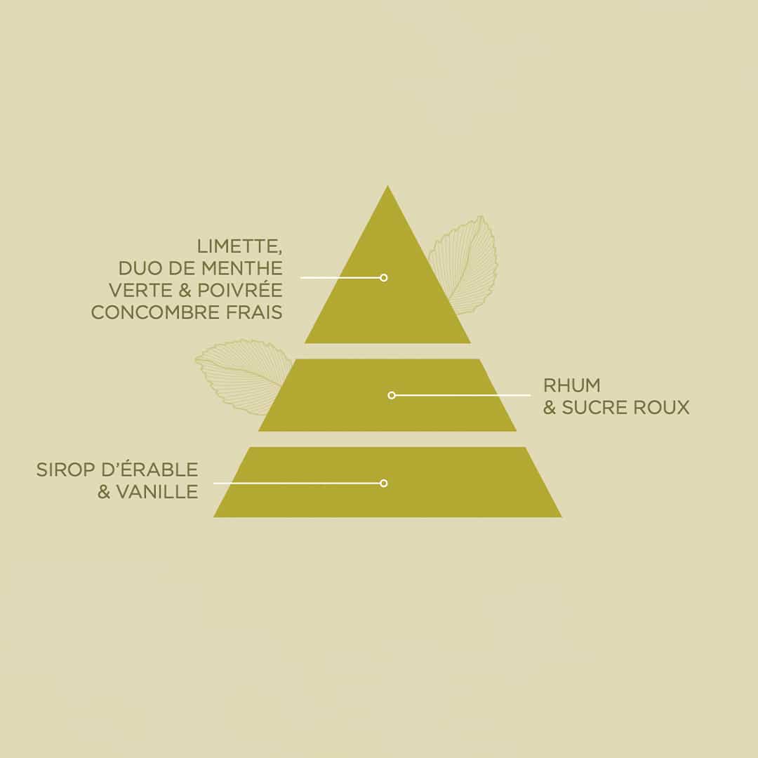 Fusantes et pénétrantes, les notes de tête fraîches et zestées (limette et menthe douce) nous embarquent immédiatement. Un cœur rhum intense se laisse alors envahir avec délice par le soda effervescent, avant que n’explose en fond un accord gourmand conviant le sirop d’érable et la vanille des îles.